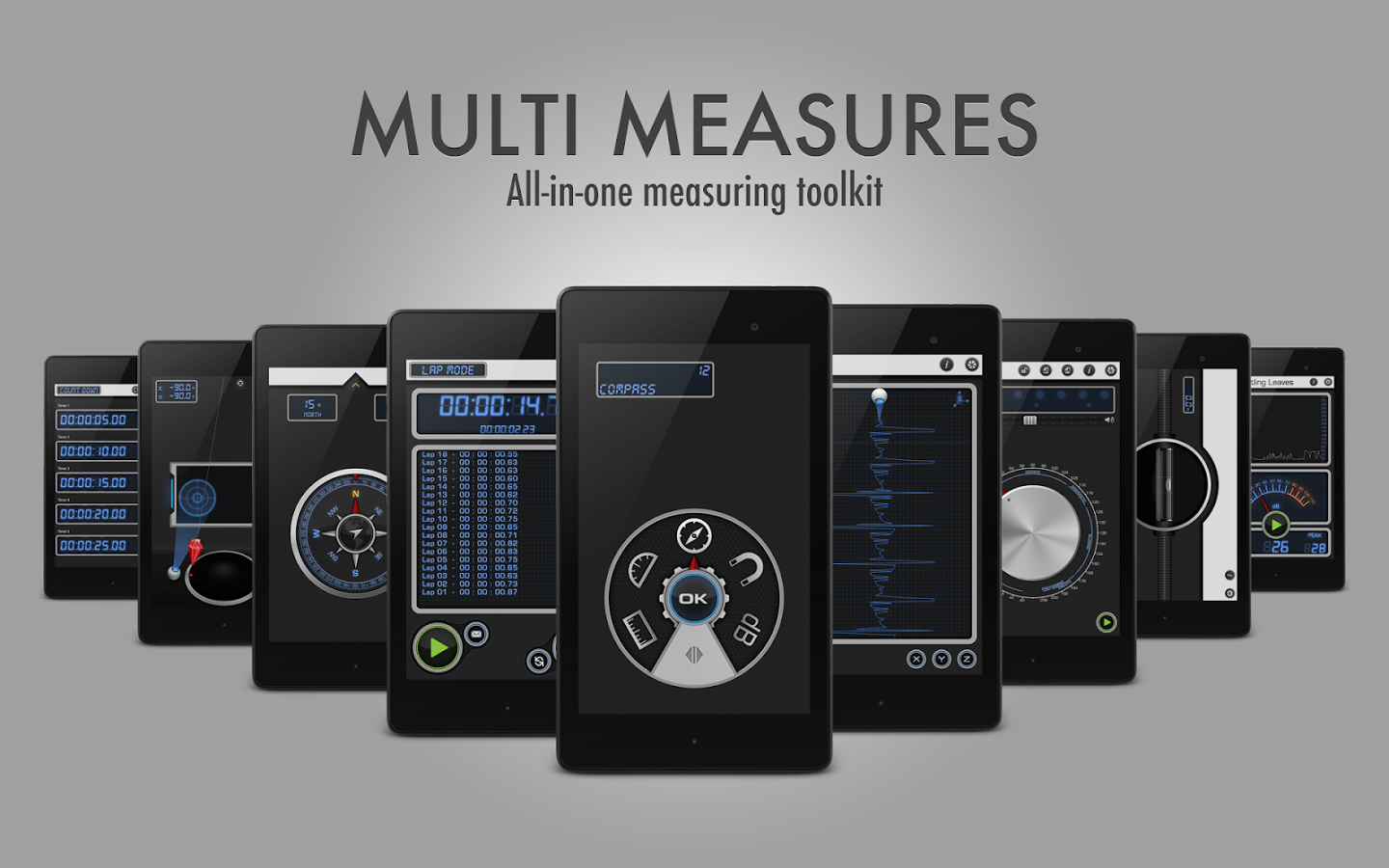 Aplikasi canggih ini mengubah ponsel pintar Anda menjadi alat ukur super lengkap yang pintar. Sejumlah tool disematkan, di antaranya alat ukur kompas, decibel, teslameter, metronome, stopwatch, timer, seismometer, plumb bob, level permukaan, spirit level (bubble level), penggaris dan protractor.