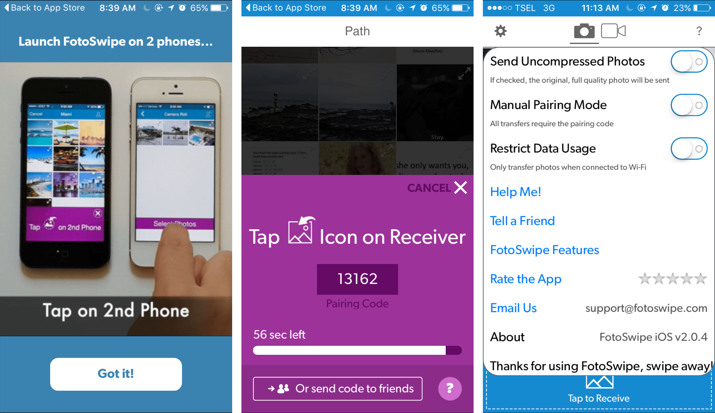 Kini terdapat sebuah aplikasi yang mampu mempermudah kegiatan berbagi foto antar smartphone bernama FotoSwipe. FotoSwipe tersedia untuk iOS dan Android.