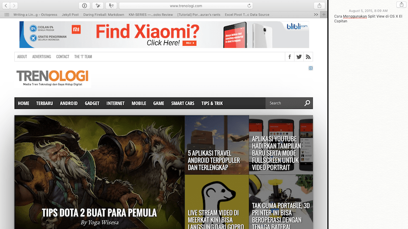 - Nah, kini dua aplikasi yang saya gunakan Safari dan Notes sudah berjalan dalam mode fullscreen menggunakan Split View.