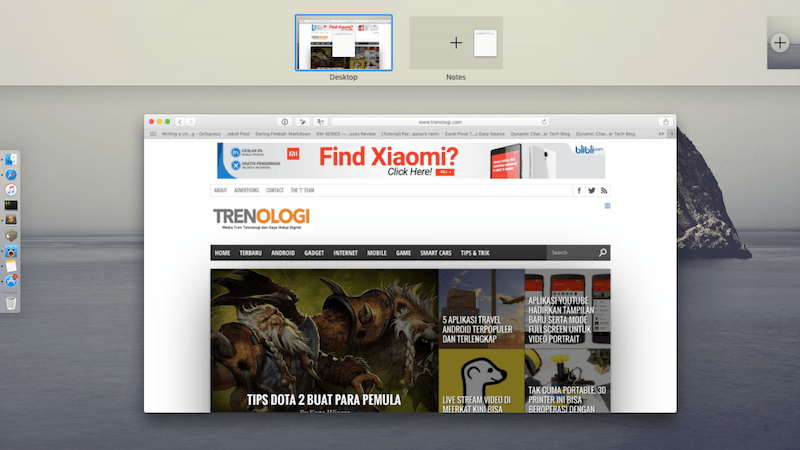 - Setelah aktif, drag aplikasi pertama, dalam tutorial kali ini saya menggunakan aplikasi Notes, pada Mission Control dan akan muncul Desktop tambahan. Secara otomatis aplikasi Notes akan berjalan dalam mode fullscreen